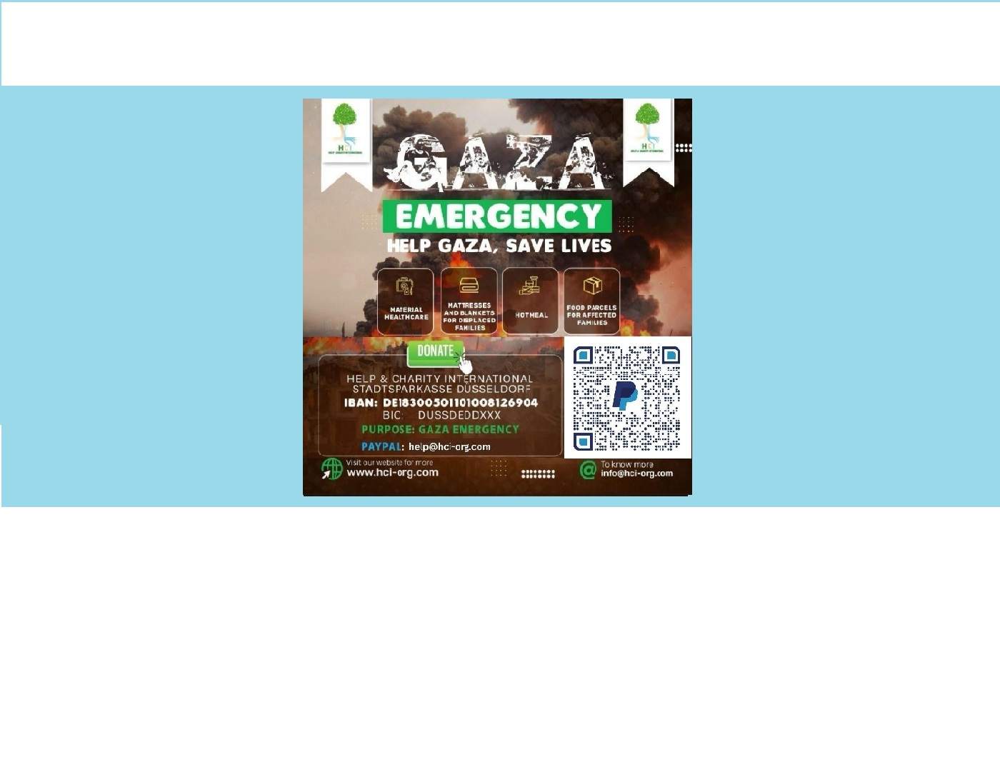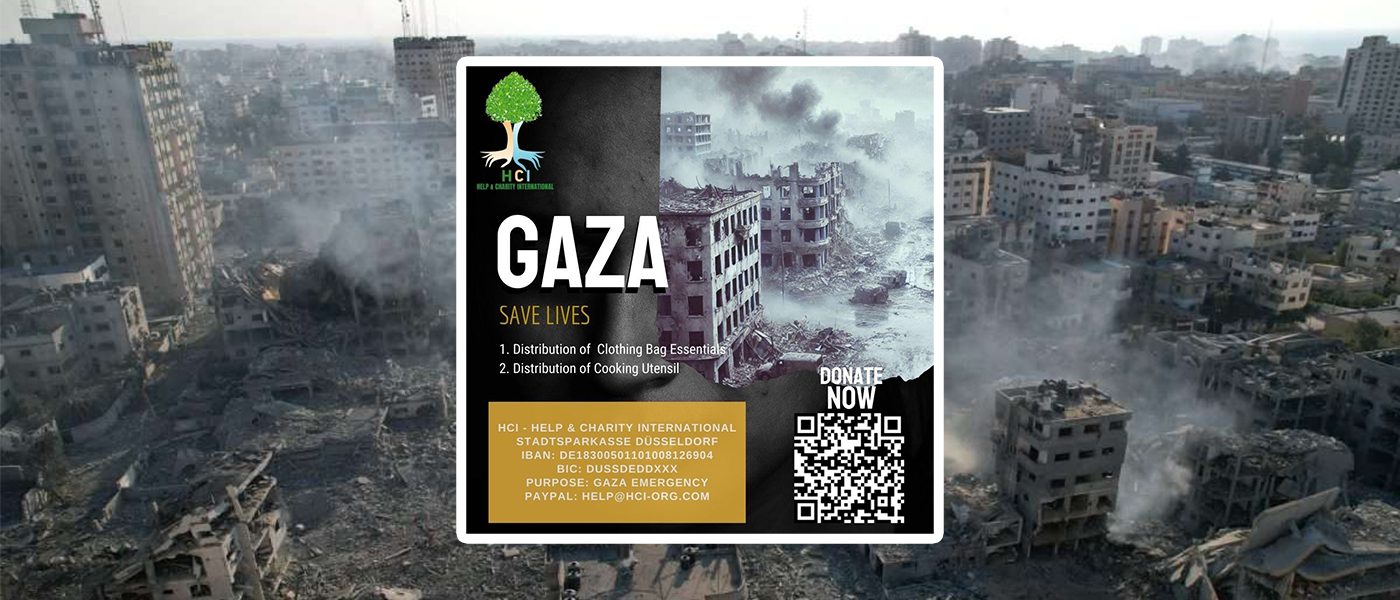Liebe Freunde, Familie und Unterstützer, Die Wohltätigkeitsorganisation HCI - Help & Charity International setzt ihre Unterstützung für Flüchtlinge und für der Opfer des Krieges in Gaza fort. Kinder, Frauen und Männer warten auf medizinische Versorgung und Nahrungsmittel...